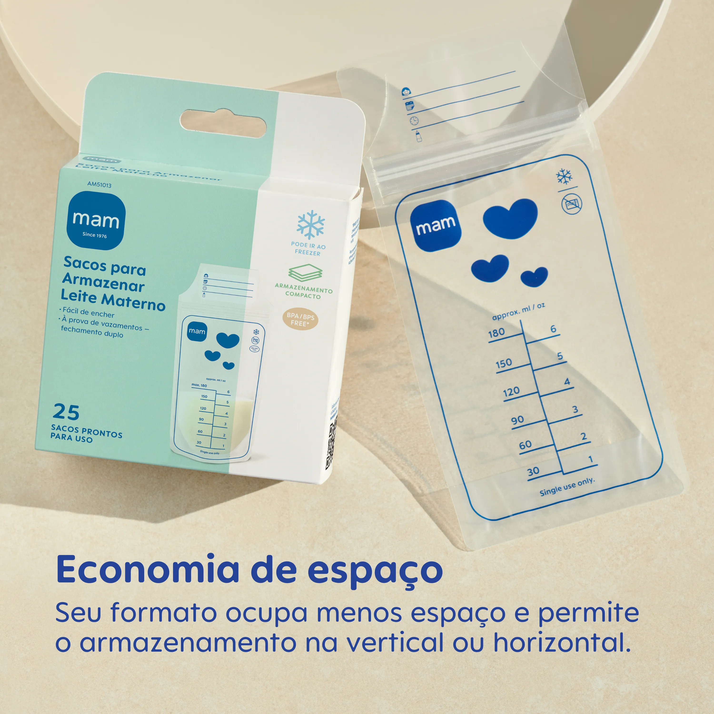 Ocupam menos espaço e podem ser armazenados na vertical ou horizontal, permitindo organizar um grande estoque de leite materno com eficiência.