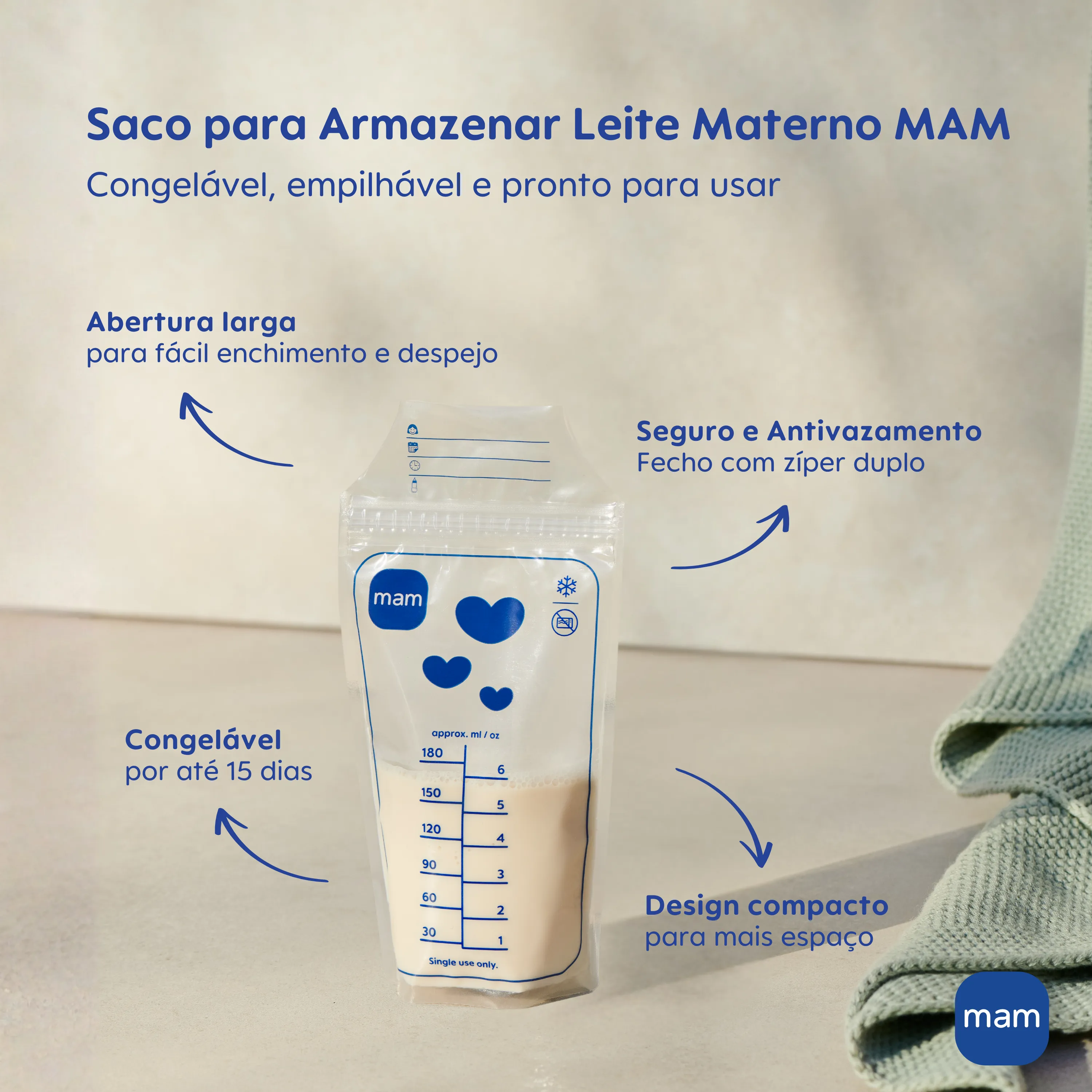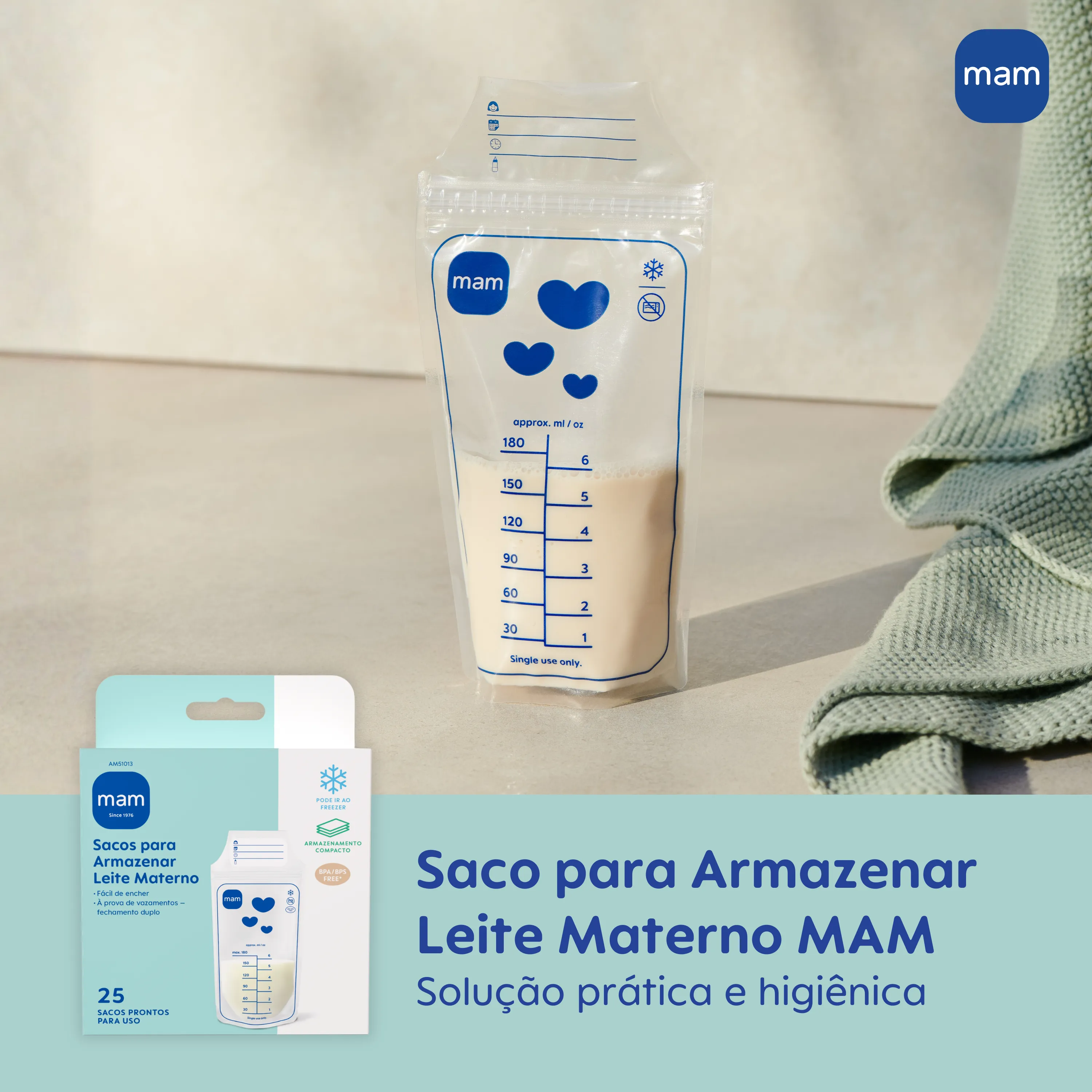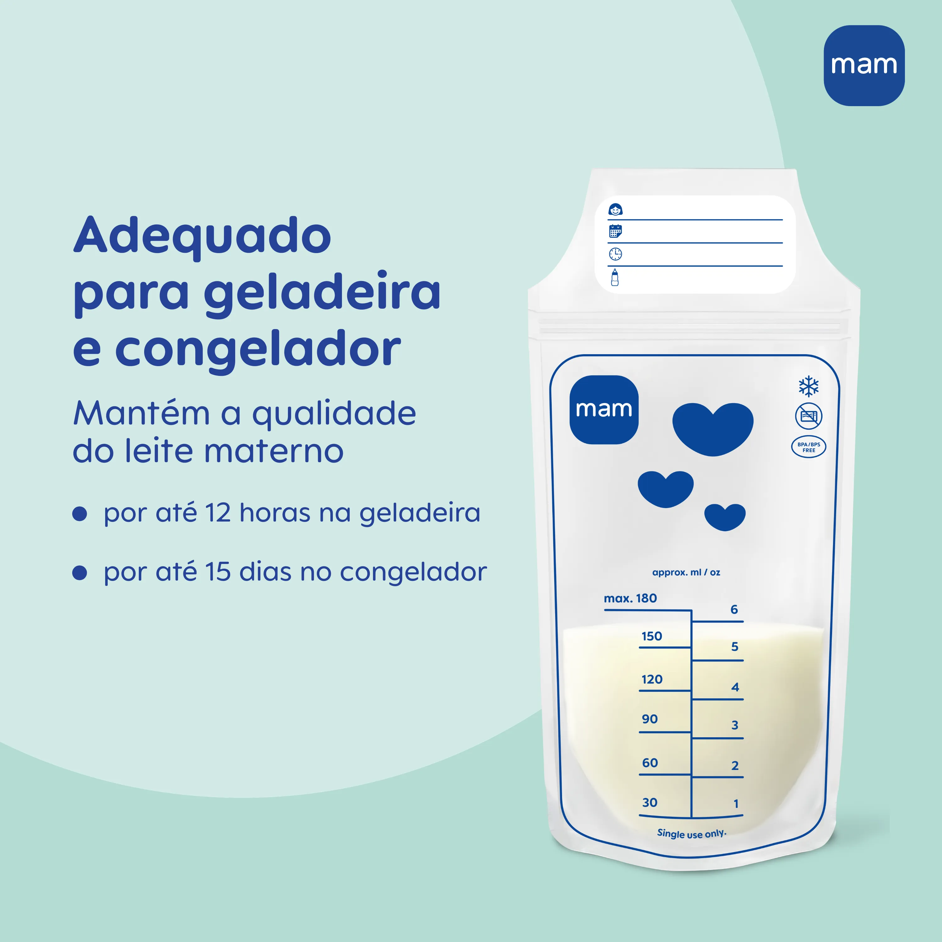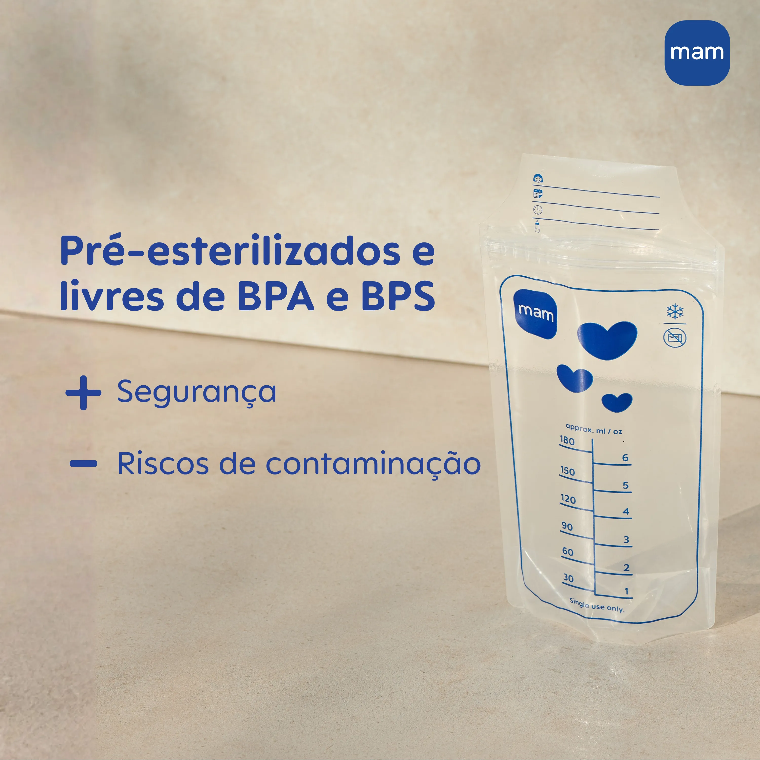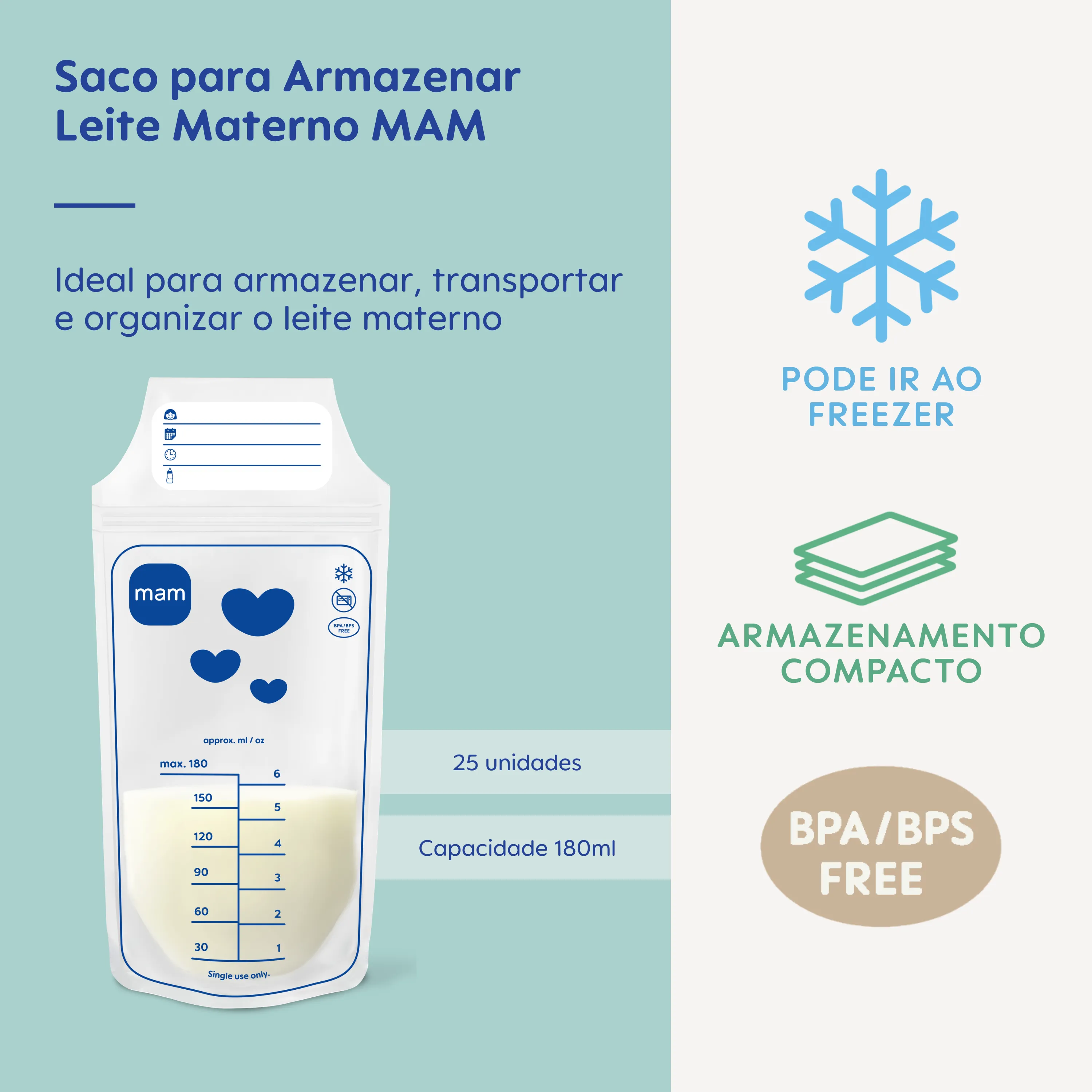 Os Sacos para Armazenar Leite Materno MAM são uma solução completa e confiável para armazenar, transportar e organizar o leite materno com tranquilidade e eficiência. São 25 unidades de 180 ml, livres de BPA e BPS, pré-esterilizadas e prontas para uso, garantindo segurança para o bebê e proteção contra contaminações. Seu formato ocupa menos espaço do que potes e permite o armazenamento tanto na vertical quanto na horizontal, otimizando espaço no refrigerador ou congelador. A estrutura fina acelera o congelamento e o descongelamento, facilitando o uso quando necessário. Com vedação dupla à prova de vazamentos, os Sacos Mam mantêm o leite seguro durante o transporte, o armazenamento e o congelamento. A abertura larga facilita o enchimento e o esvaziamento, enquanto a área de anotações permite registrar nome do bebê, data, horário e quantidade. Compatíveis com as Bombas Tira-Leite Mam, possibilitam extração direta no saco, tornando o processo ainda mais higiênico e prático. Mas também funcionam perfeitamente para armazenar o leite extraído em outros recipientes. Por serem de uso único, os sacos dispensam esterilização após a utilização. Seu material flexível e resistente não quebra em quedas e suporta a expansão natural do leite ao congelar.
