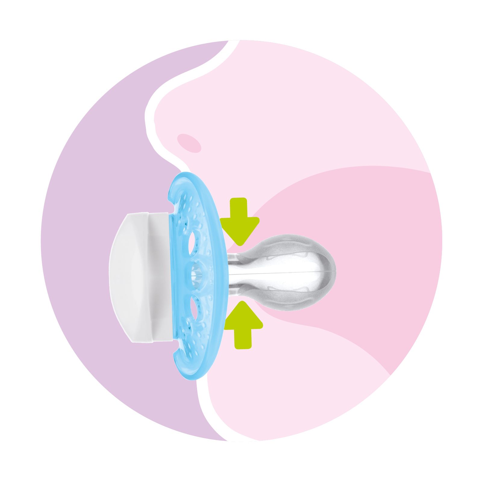 Les sucettes MAM sont équipées d'un système de ventilation intégré dans la téterelle. Lorsque la bouche du bébé se referme sur la téterelle, l'air à l'intérieur de la téterelle est expulsé à travers le système de ventilation et la téterelle s'aplatit pour s'adapter à la cavité buccale du bébé.