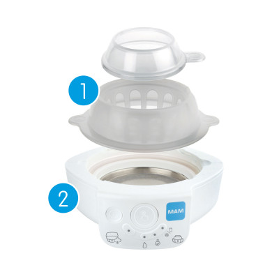 xΚατάλληλο για να απολυμαίνει έως 6 μπιμπερό ΜΑΜ και έως 5 πιπίλες. Για περισσότερες λεπτομέρειες, ρίξτε μια ματιά στον πίνακα που περιλαμβάνεται στις οδηγίες χρήσης. Η διάρκεια 5 λεπτών αφορά τη μέθοδο στον φούρνο μικροκυμάτων με ισχύ 1850 W.