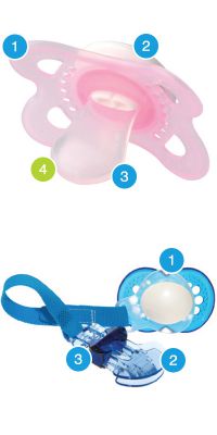 All MAM pacifiers have a flat and symmetrical nipple shape: there is no ‘top’ or ‘bottom’. This special nipple shape ensures that our pacifiers are always correctly positioned in the babies’ mouth.