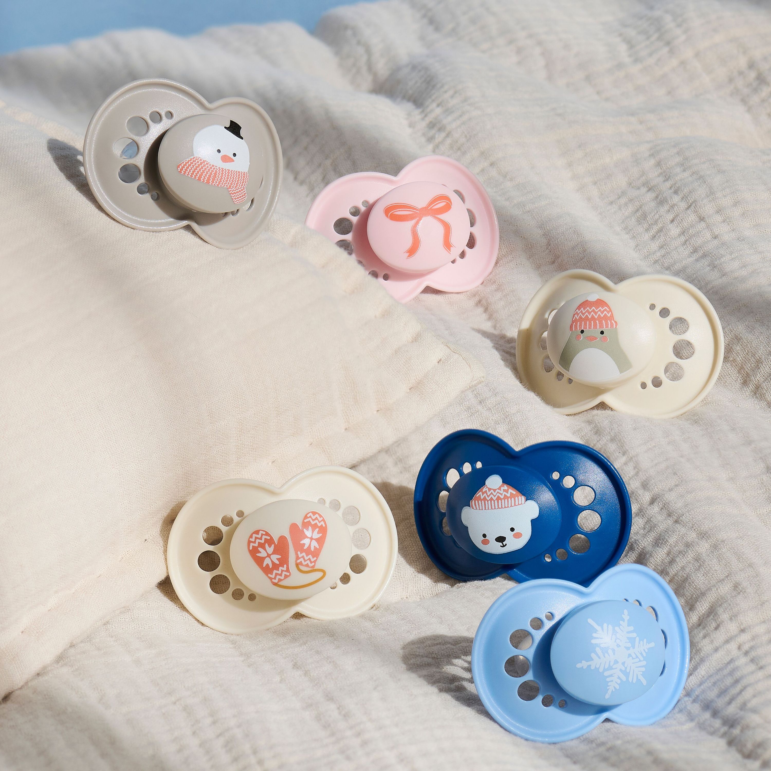 All MAM pacifiers have a flat and symmetrical nipple shape: there is no ‘top’ or ‘bottom’. This special nipple shape ensures that our pacifiers are always correctly positioned in the babies’ mouth.